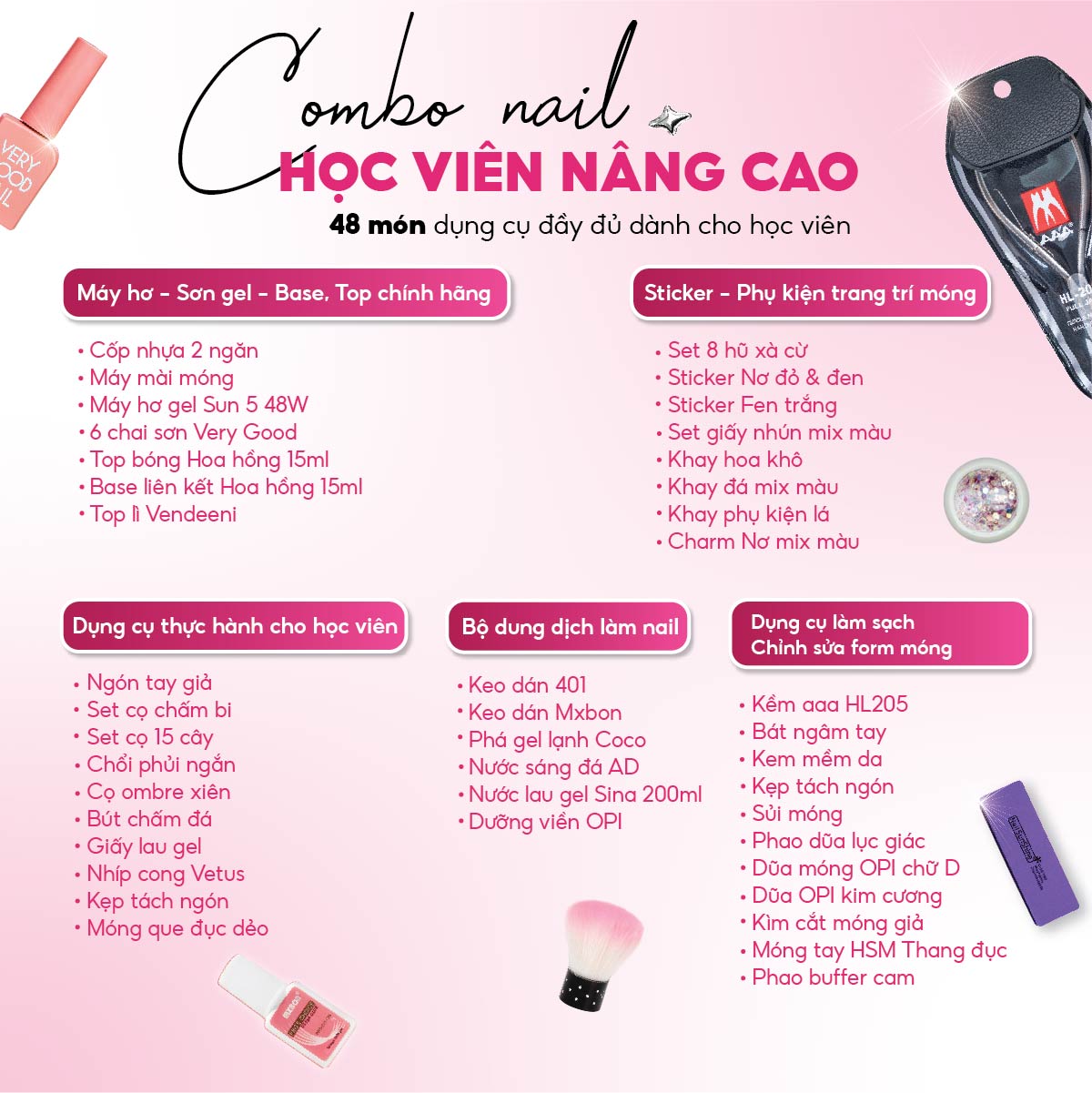 Combo học viên nâng cao là phiên bản cải tiến hơn của combo học viên cơ bản, đáp ứng đủ nhu cầu thực hành những mẫu nail nâng cao và muốn cải thiện tay nghề, có đầy đủ dụng cụ để thực hiện được đa dạng mẫu nail nghệ thuật, vẽ tạo hình, nặn trang trí, đính đá.