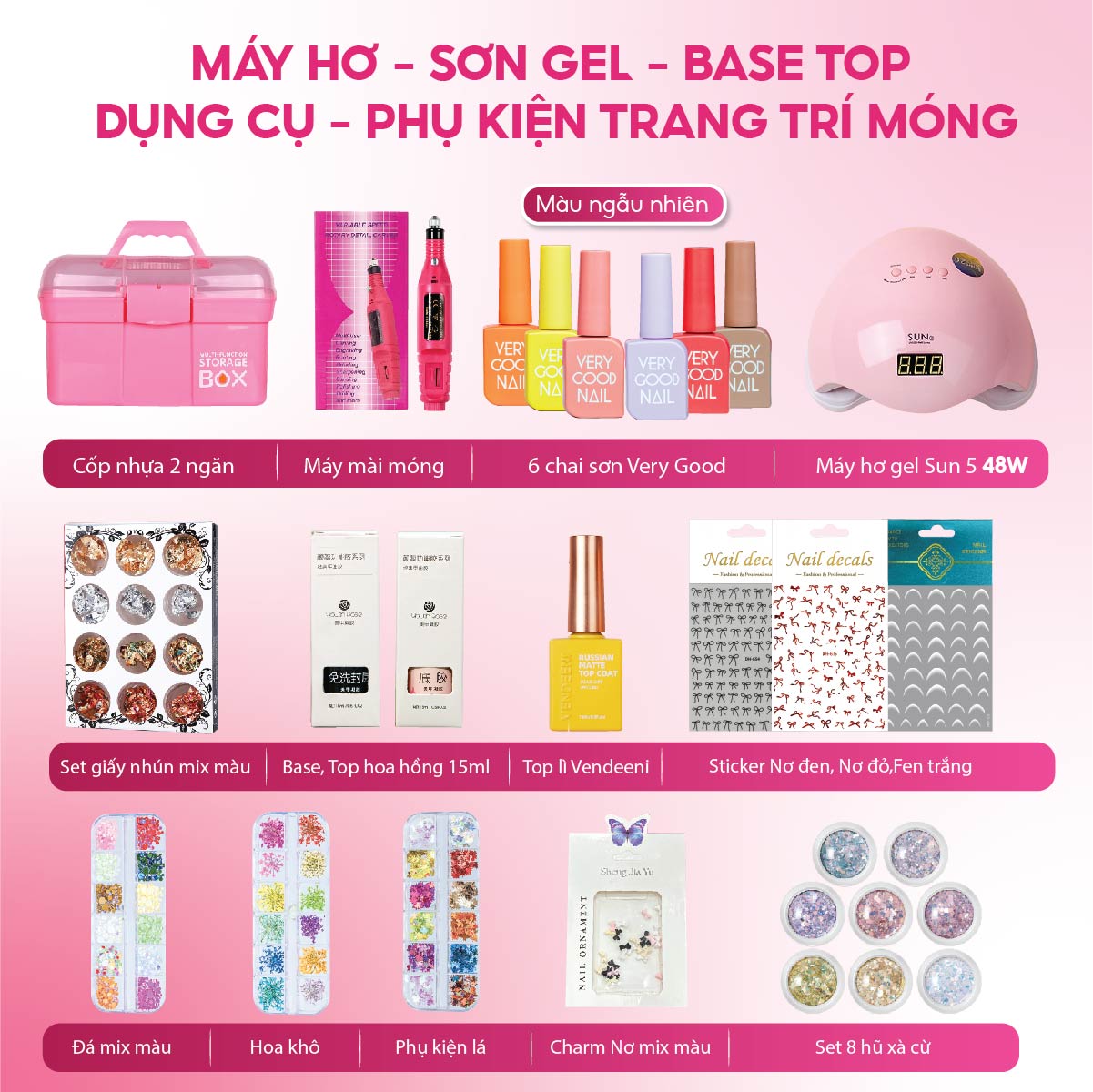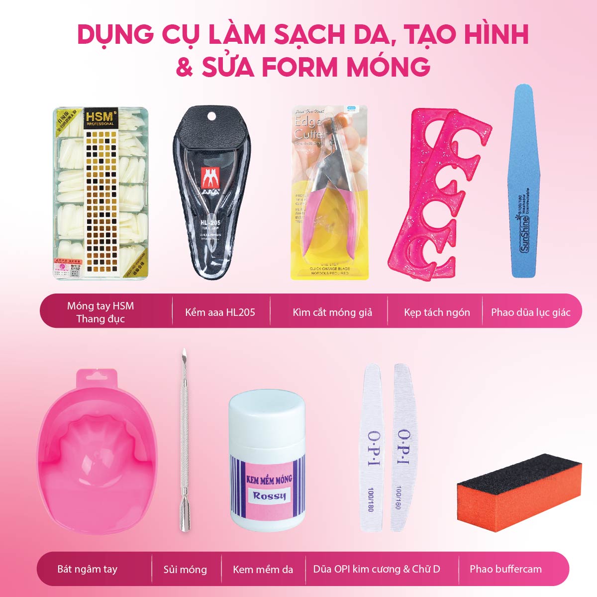 Bộ dụng cụ bao gồm 43 sản phẩm đa dạng với đầy đủ dụng cụ làm sạch da, chỉnh sửa form móng: kềm cắt da, phao dũa, những sản phẩm chuyên dụng như máy hơ, base, top, bộ combo còn có đầy đủ, sơn gel, dụng cụ thực hành trang trí như móng que, móng mẫu.
