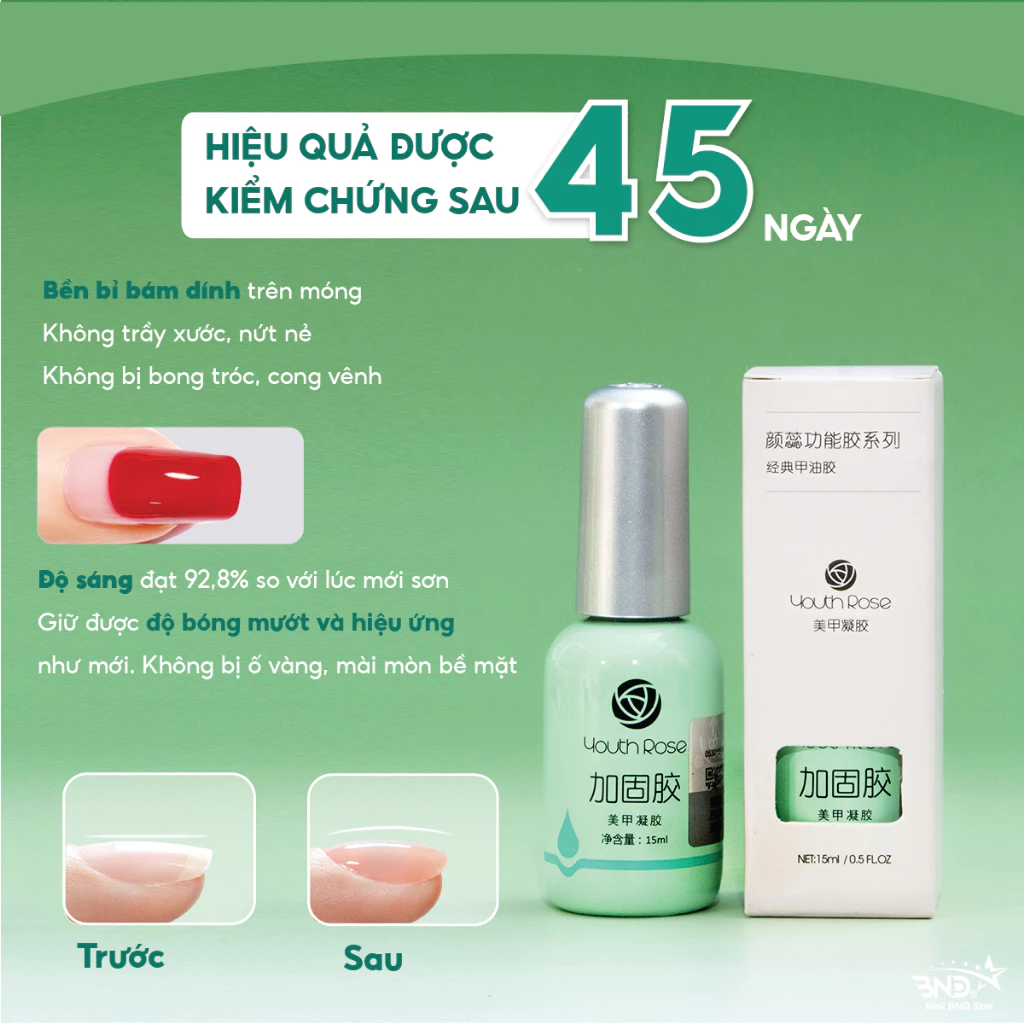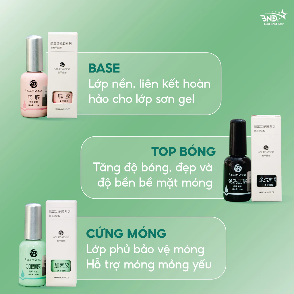 – Cứng móng Youth Rose: Gel phủ lên bề mặt móng có công dụng gia tăng độ cứng bề mặt của móng tay, giúp cho móng được chắc khỏe hơn. Thường dùng cho các loại móng mỏng, móng yếu hoặc móng bị hư do làm nail quá nhiều.