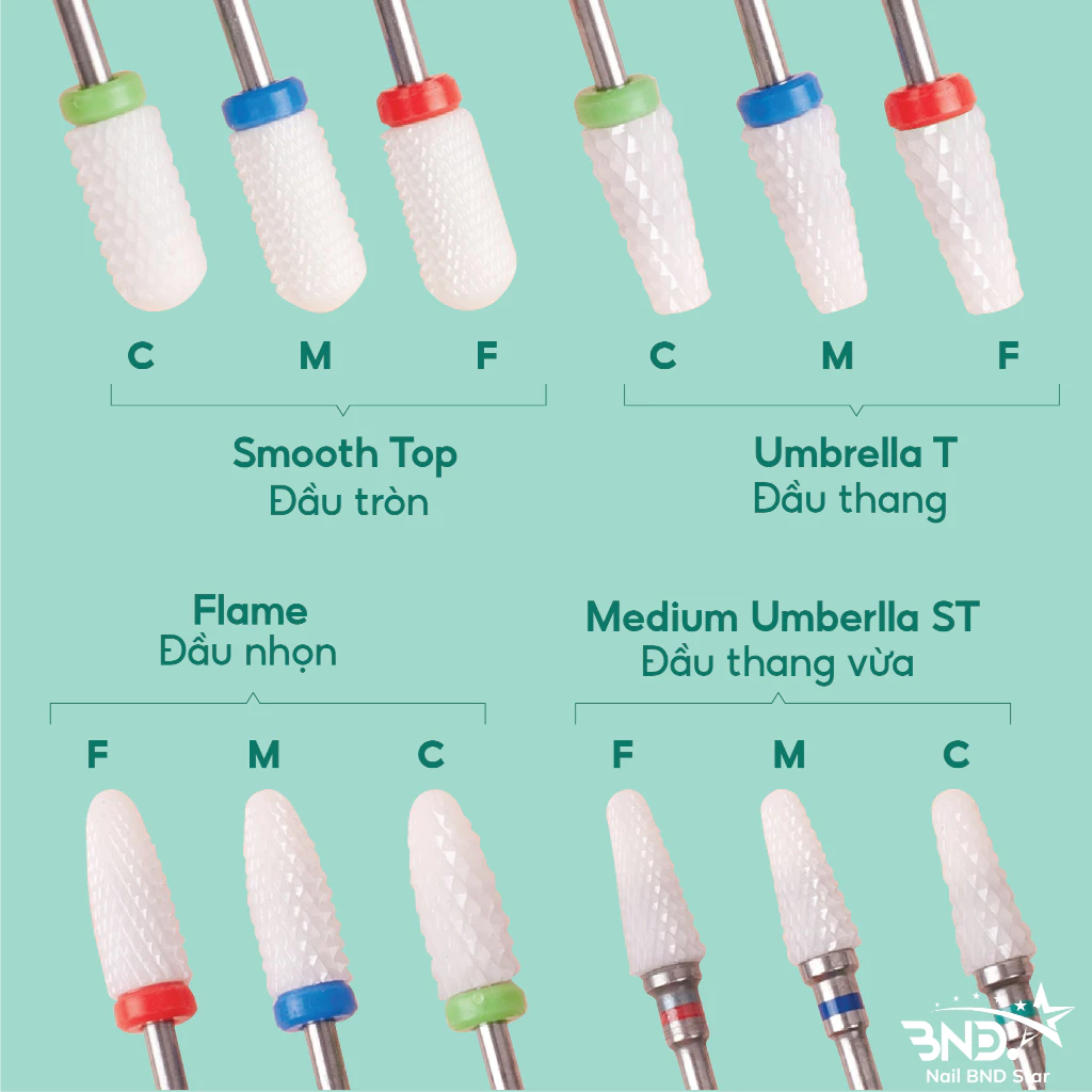 Shop có đa dạng hình dáng đầu mài cũng như đầy đủ đầu mài phá gel/bột, mài mịn, mài khóe để các thợ nails thoải mái lựa chọn đầu phù hợp với tay nghề.