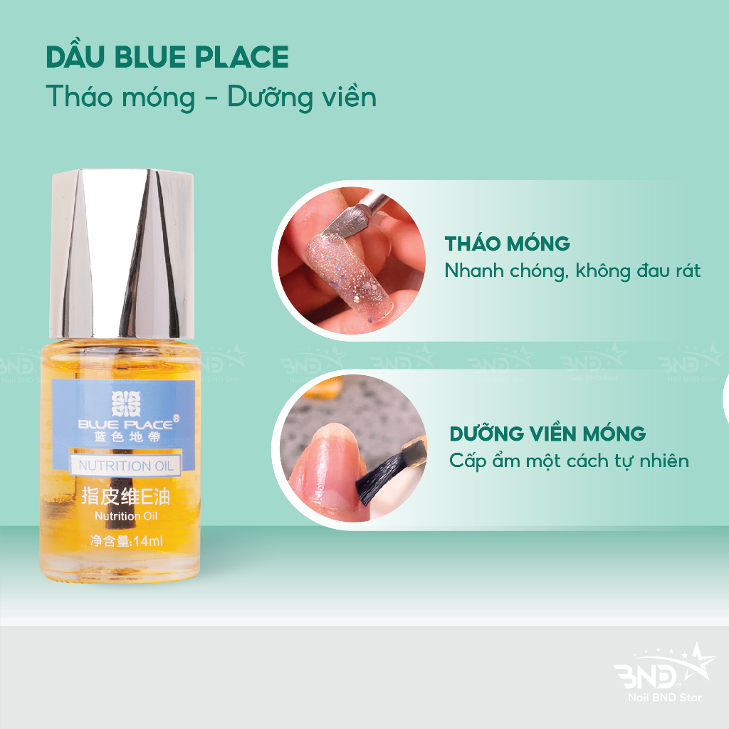 Dầu Blue Place (Nutrition Oil) là một loại dầu có hai công dụng chính dùng để tháo móng và dưỡng viền móng. Sản phẩm chứa nhiều dưỡng chất tốt cho móng và lớp biểu bì xung quanh móng, có thành phần an toàn không gây hại da và móng. Dầu Blue Place có mùi hương cam ngọt dễ chịu.