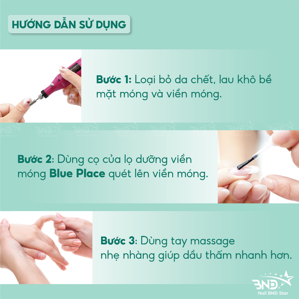 Dầu dưỡng viền móng Blue Place: Trong dầu Blue Place chứa nhiều thành phần giúp dưỡng da, cấp ẩm, phục hồi móng và da xung quanh, giúp móng chắc khỏe từ Vitamin E, Caprylic Acid,… cùng nhiều dưỡng chất khác.
