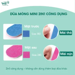 Dũa móng mini hai mặt nhám tiện lợi, 1 mặt nhám thô màu xanh (size 240) và 1 mặt nhám mịn màu hồng (size 180) tiện lợi để thực hiện dũa form và dũa mịn, không cần dùng thêm loại dũa khác.