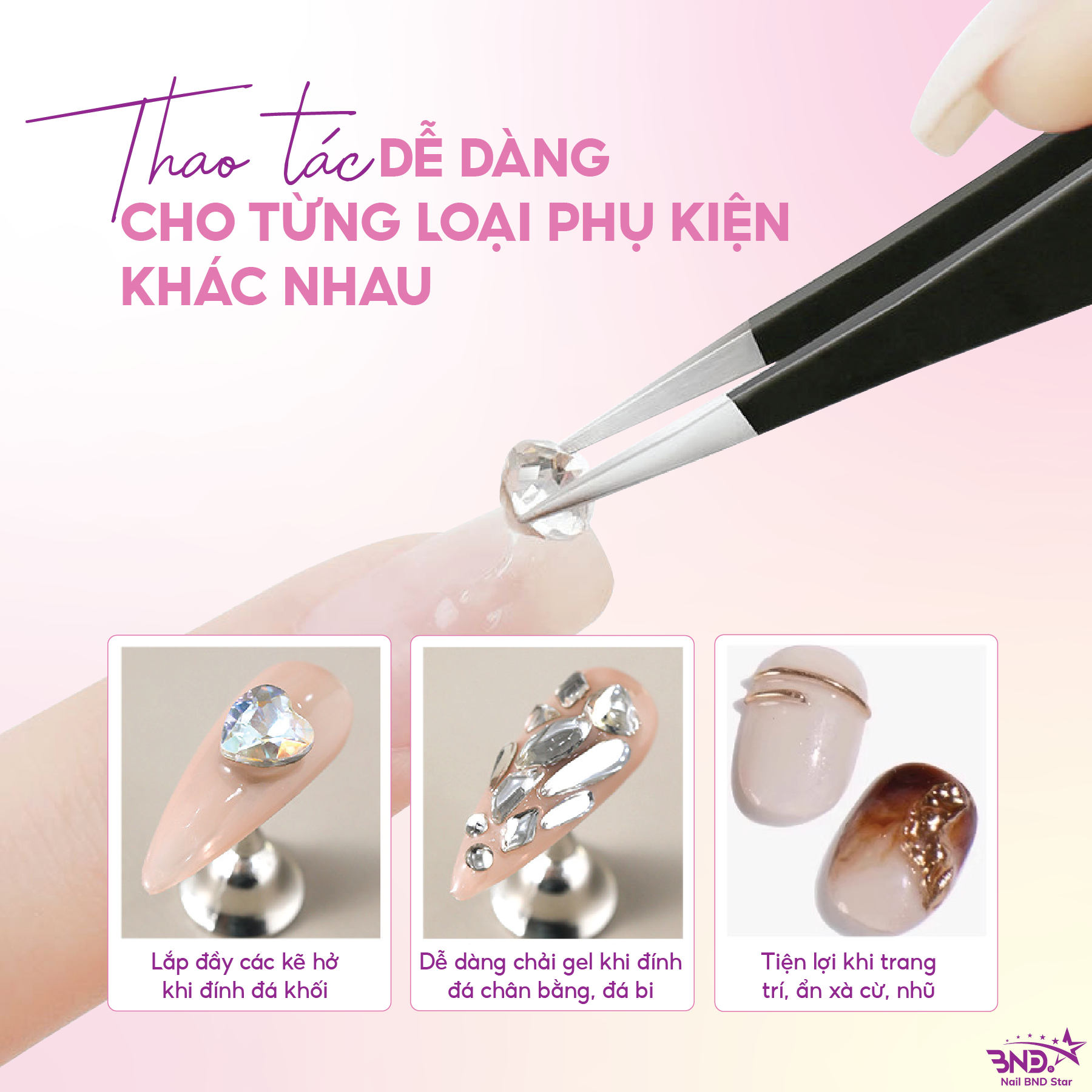 Bước 4: Trải bồi gel vào các kẽ hở và chân của phụ kiện để tăng độ liên kết. Cuối cùng hơ đèn là hoàn thành.