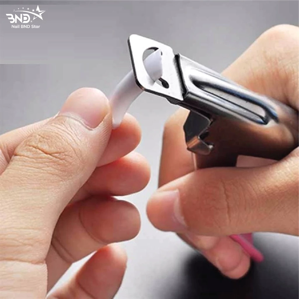 + Sau khi hoàn thành công đoạn dán móng giả lên móng thật ta đưa phần đầu móng giả qua lưỡi căt của kìm, giữ móng theo độ dài muốn cắt. Sau đó dùng lực tay bóp từ từ cho đến khi móng giả được cắt loại bỏ.