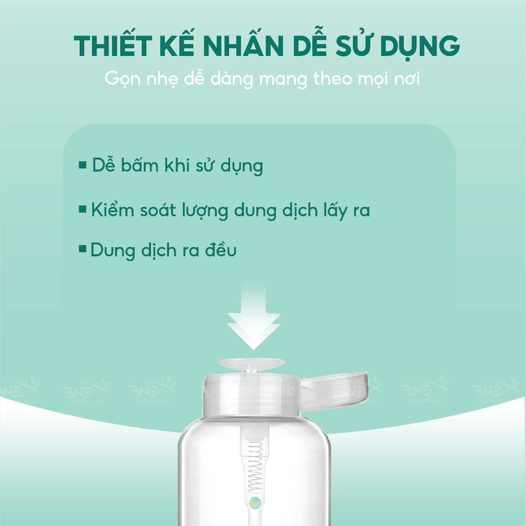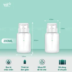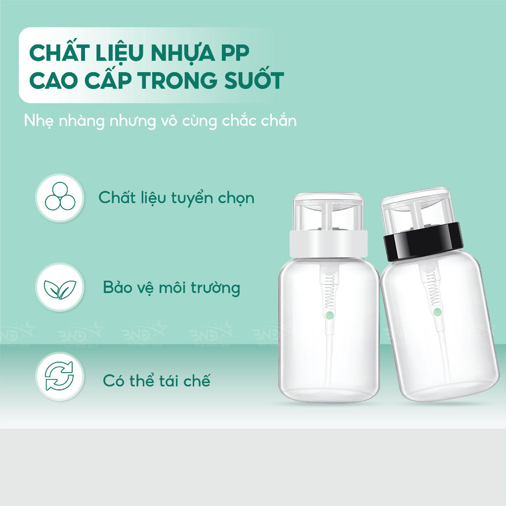 Lọ được làm bằng nhựa plastic siêu bền. Lò so xịn chịu được lực nén tốt nên các chị nhấn lấy cồn và acetone thoải mái không lo bị hỏng vòi hút.