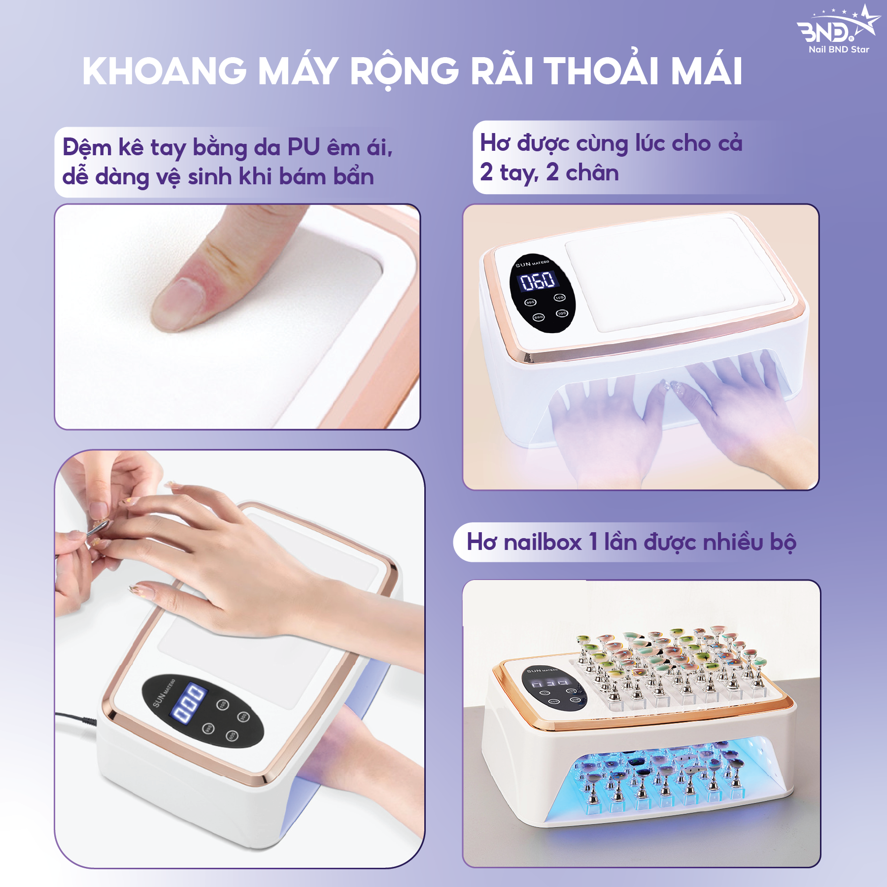 Máy hơ gel có thiết kế gọn nhẹ, sở hữu khoang hơ rộng có thể thực hiện hơ cùng lúc cho cả 2 tay và 2 chân, thân máy có đệm kê tay được bọc da PU tạo cảm giác thoải mái êm ái cho khách hàng.