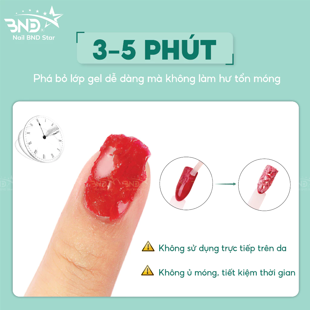 + Không sử dụng trực tiếp trên da (để tạo cảm giác an toàn cho khách, thợ nails có thể dùng kèm với sơn chống lem viền móng, bôi lớp sơn này xung quanh viền để phòng khi nước phá gel lem ra thì sẽ không ảnh hưởng đến da tay khách)