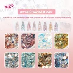 Nhũ vảy cá có dạng set 8 hủ mix theo từng tone màu, có nhiều hạt nhũ với kích thước to nhỏ khác nhau từ hạt kim tuyến mịn cho đến hạt vảy cá to, khi đính lên móng giúp cho bộ móng thêm lấp lánh, thu hút. Thợ nail dễ dàng kết hợp tạo ra nhiều bộ nail xu hướng