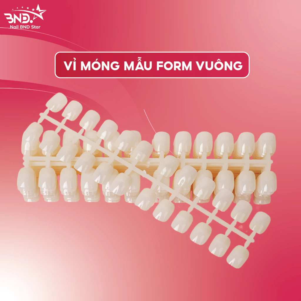 Vỉ móng mẫu phom vuông tập sơn được làm từ nhựa loại 1, với các vết cắt tinh xảo, không nhựa thừa giúp thợ nail test sơn lên móng mẫu như là móng thật, phổ biến với các mẫu vẽ hoạt hình, thỏa sức sáng tạo thêm nhiều mẫu móng mới để khách hàng lựa chọn, bảo quản sử dụng lâu và tiết kiệm được nhiều chi phí cho việc mua mẫu móng mới. Đặc biệt, liên kết giữa móng và vỉ có độ dai nhất định, dễ dàng tách móng ra khỏi vỉ rồi gắn lên khung trưng bày móng.