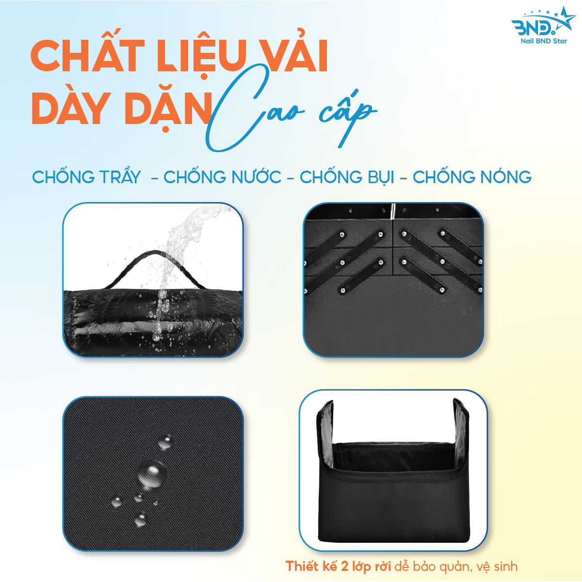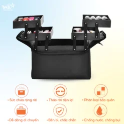 Cốp vải 2 tầng đựng đồ nail là một sản phẩm cần thiết dùng để đựng đồ nghề, dụng cụ phụ kiện chuyên dụng quen thuộc cho chị em làm nghề nail, mi, make-up bởi thiết kế gọn nhẹ, tiện lợi rất thích hợp cho việc mang theo, di chuyển.