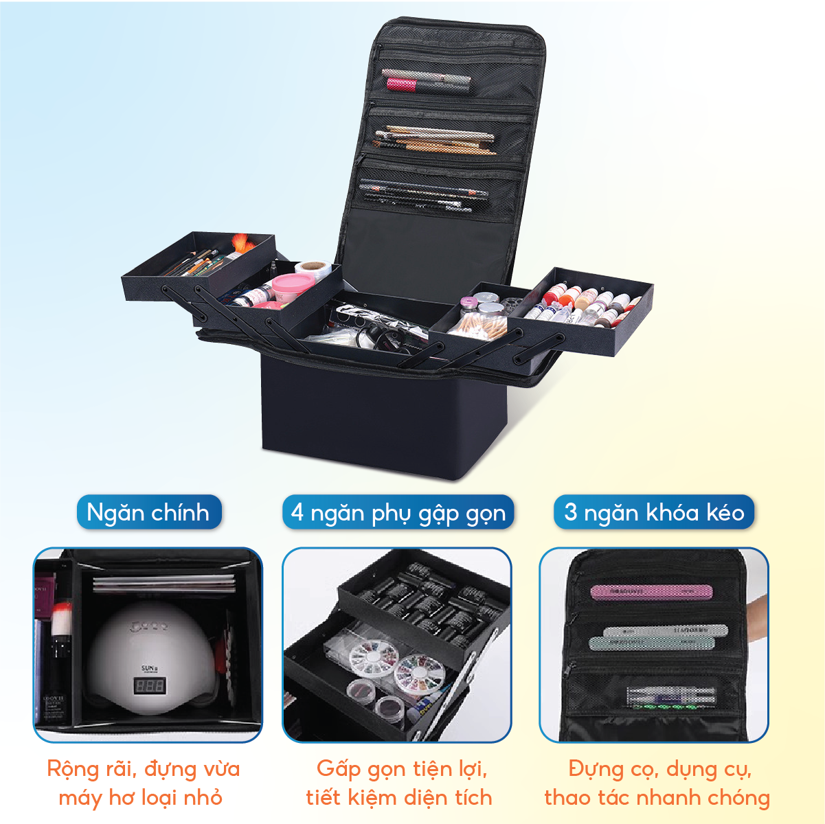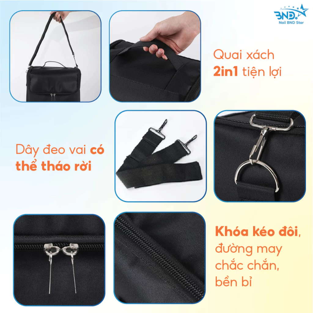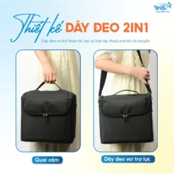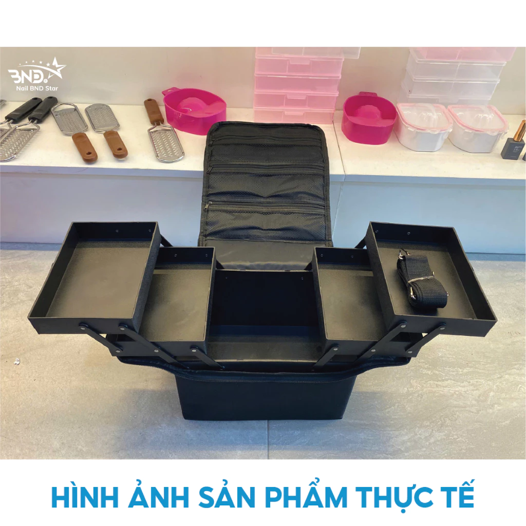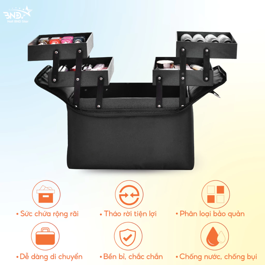 Cốp vải đa năng có thiết kế với 5 khay chứa 1 khay lớn và 4 khay phụ gấp gọn được. Khoang ngăn lớn rộng rãi đựng vừa 1 máy hơ loại nhỏ, máy mài và 1 số dụng cụ khác, 4 ngăn phụ có thể gập gọn và kéo ra tùy thích tùy thích để thợ nail có thể phân chia và sắp xếp phụ kiện theo phân loại, tiện lợi và dễ dàng hơn khi sử dụng.