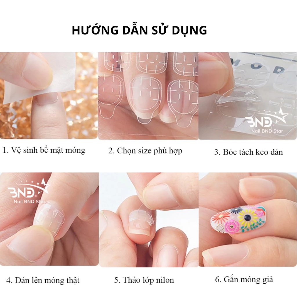 + Bước 3: Đặt móng giả lên móng thật, giữ trong vòng 5s. Tiếp tục, thực hiện các bước còn lại để hoàn thiện móng.