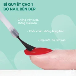 + Bước 5: Cuối cùng ta lấy một lượng top phủ (Top Coat) vừa đủ chải đều lên bề mặt của móng, sau đó đưa tay vào máy hơ UV/LED với thời gian thích hợp khoảng từ 30_60s (tùy vào loại máy hơ các bạn sử dụng). Vậy là chúng ta đã có một bộ móng hoàn chỉnh siêu bền đẹp rồi.