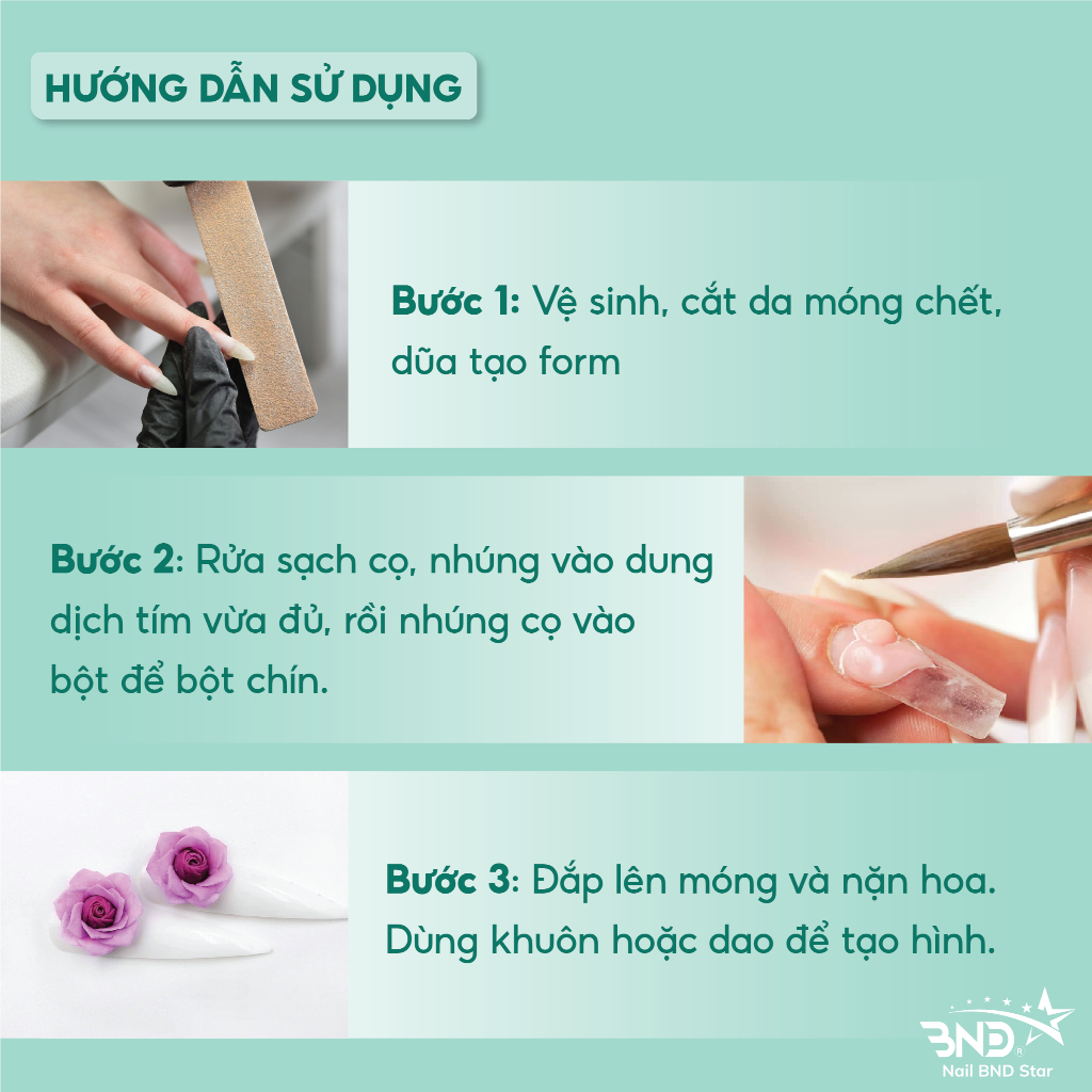 – Bước 3: Khi bột đã chín thì đắp lên móng và nặn hoa. Dùng khuôn hoặc dao để tạo hình, đợi khô rồi mài móng.