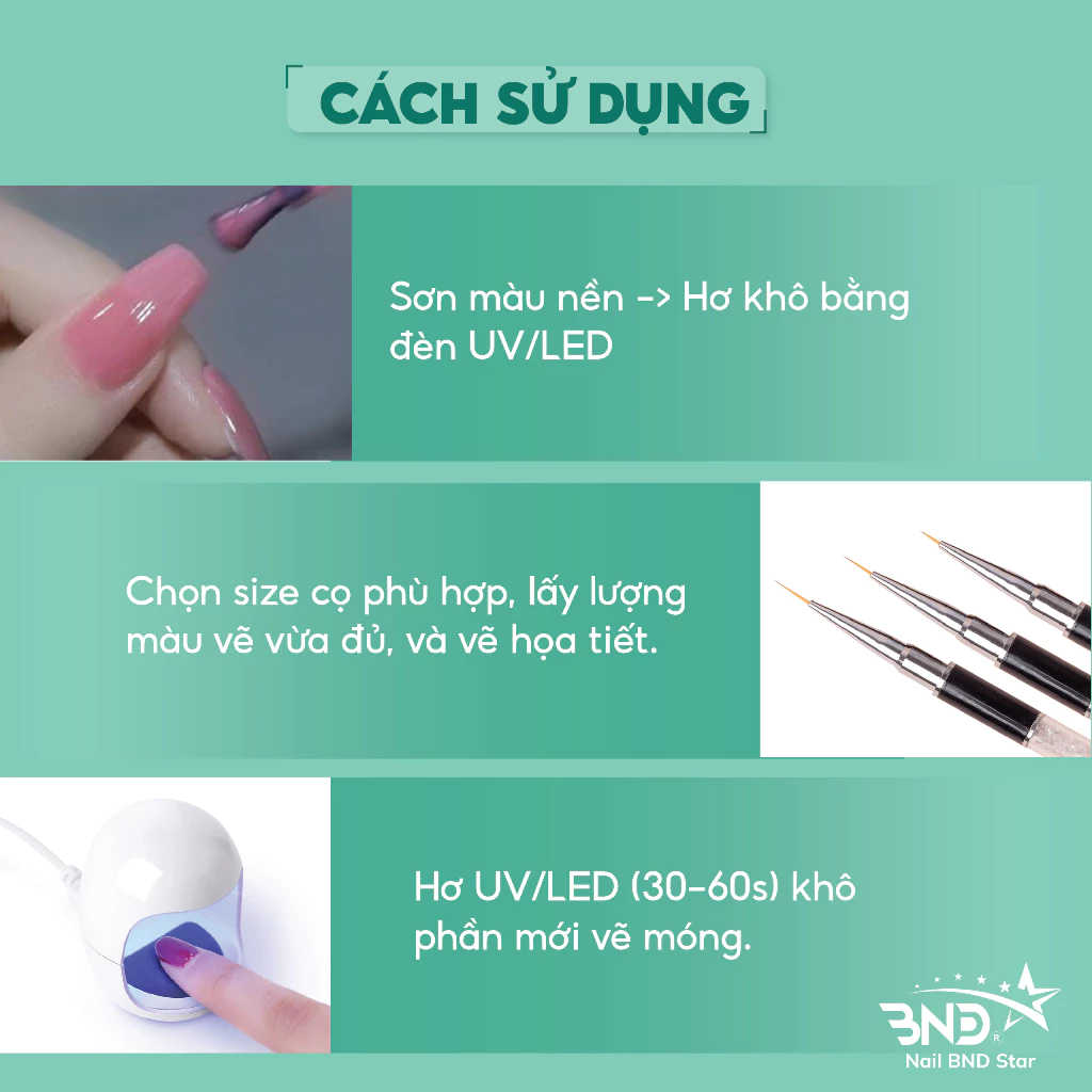 Cọ vẽ nét được thiết kế cán đá sang trọng, màu sắc thời trang. Là sản phẩm truyền thống ngành Nails được các chị em làm nghề tin dùng từ xưa đến nay, chất lượng ổn định.