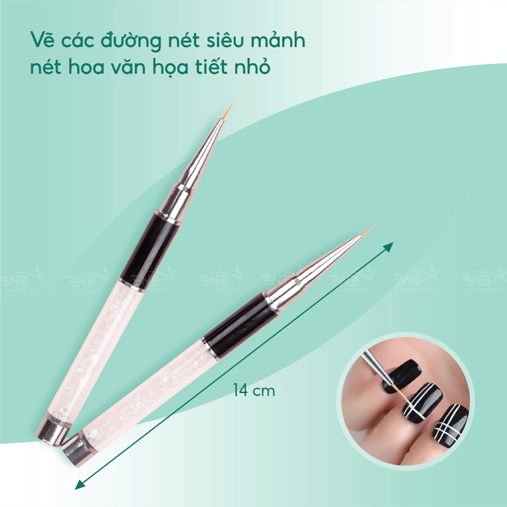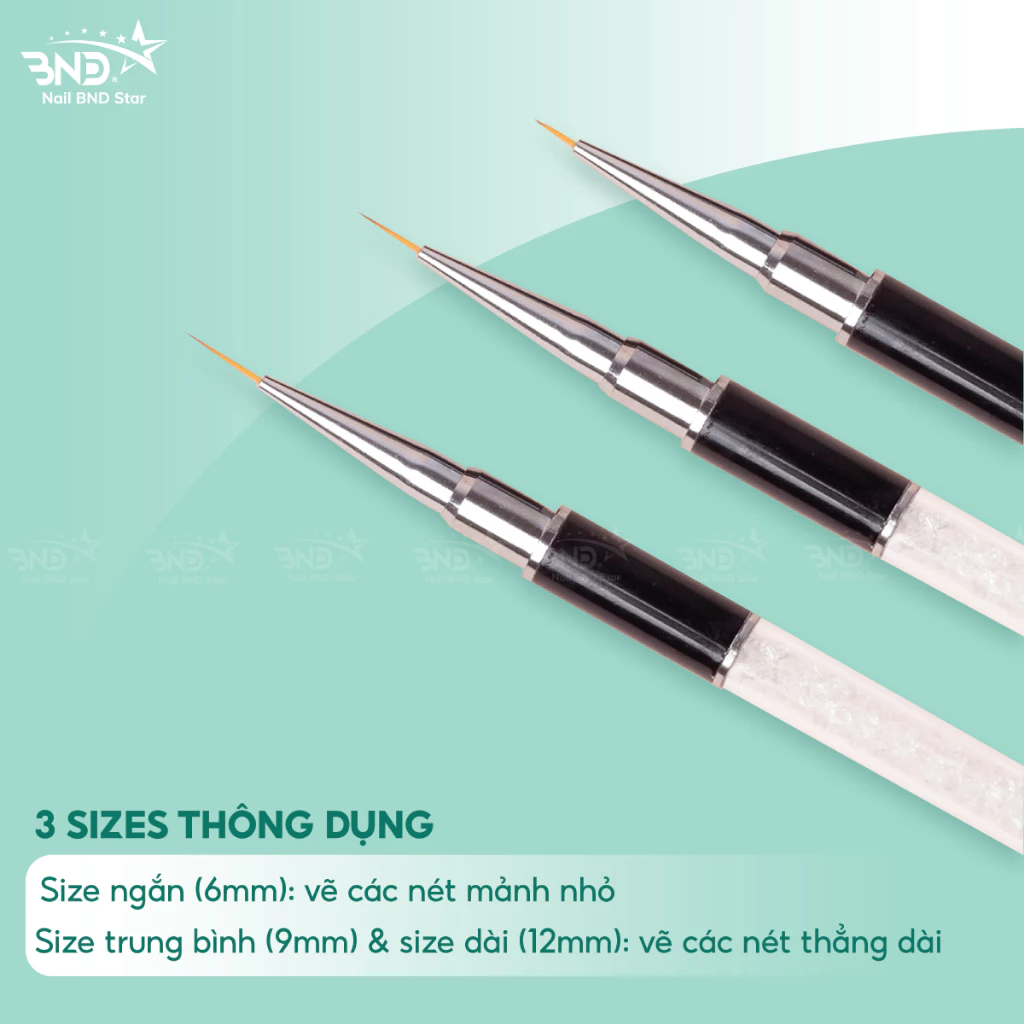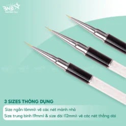 Shop có đủ 3 sizes thông dụng của chị em thợ nail: size ngắn (6mm) dùng để vẽ các nét mảnh nhỏ, size trung bình (9mm) và size dài (12mm) dùng khi chị em muốn vẽ các nét thẳng dài.