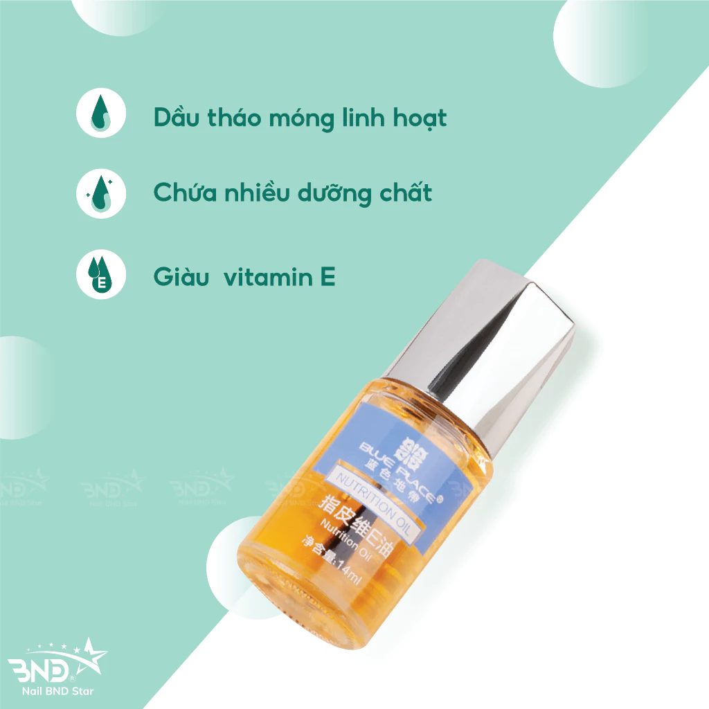 Dầu Blue Place (Nutrition Oil) là một loại dầu có hai công dụng chính dùng để tháo móng và dưỡng viền móng. Sản phẩm chứa nhiều dưỡng chất tốt cho móng và lớp biểu bì xung quanh móng, có thành phần an toàn không gây hại da và móng. Dầu Blue Place có mùi hương cam ngọt dễ chịu.
