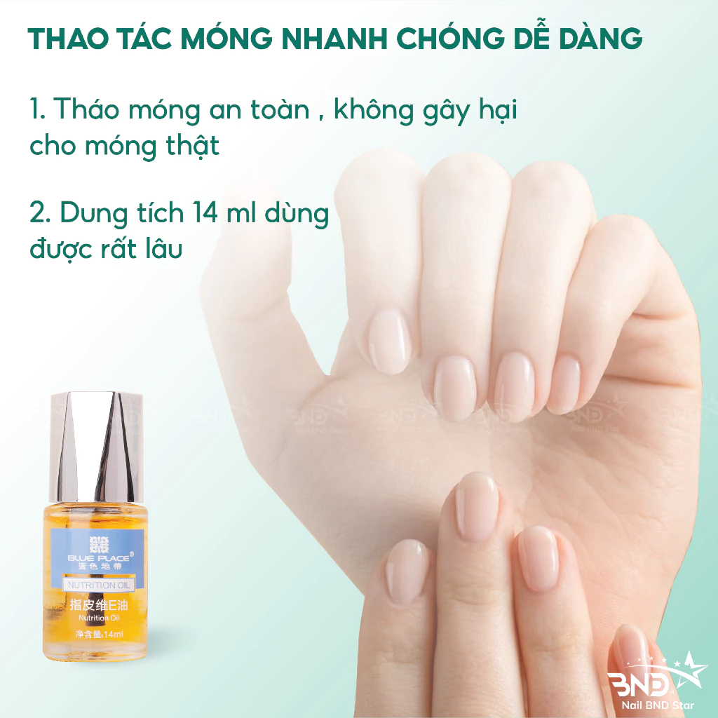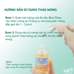 Dầu tháo móng Blue Place: Dùng dầu Blue Place để tháo các loại móng úp, móng bột, móng gel một cách tiện lợi, nhanh chóng. Không gây xước da, không tạo cảm giác nóng rát, khó chịu khi tháo móng.