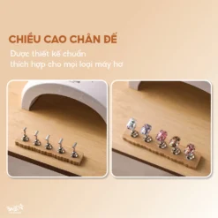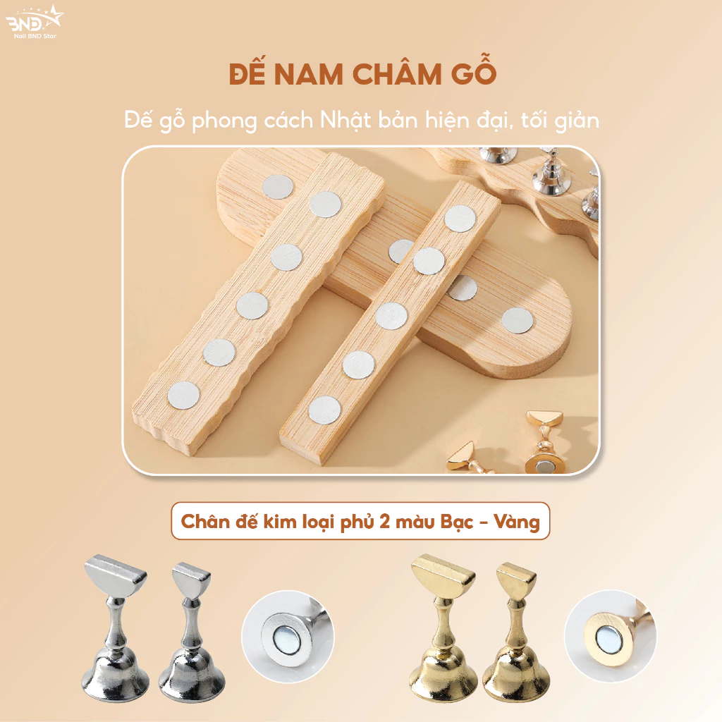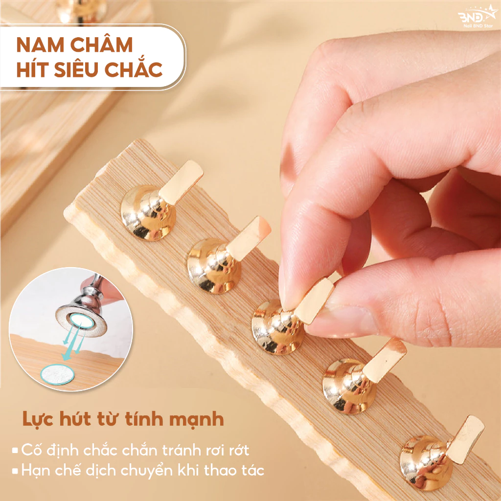 Đế gắn móng mẫu lực hút từ tính mạnh, cố định móng giả chắc chắn và thuận tiện khi thao tác. Thiết kế hình dáng quân cờ mạ (bạc, vàng), chân đế bằng gỗ phong cách nhật bản tinh tế, sang trọng. Thích hợp để trang trí hoặc dạy học nail.