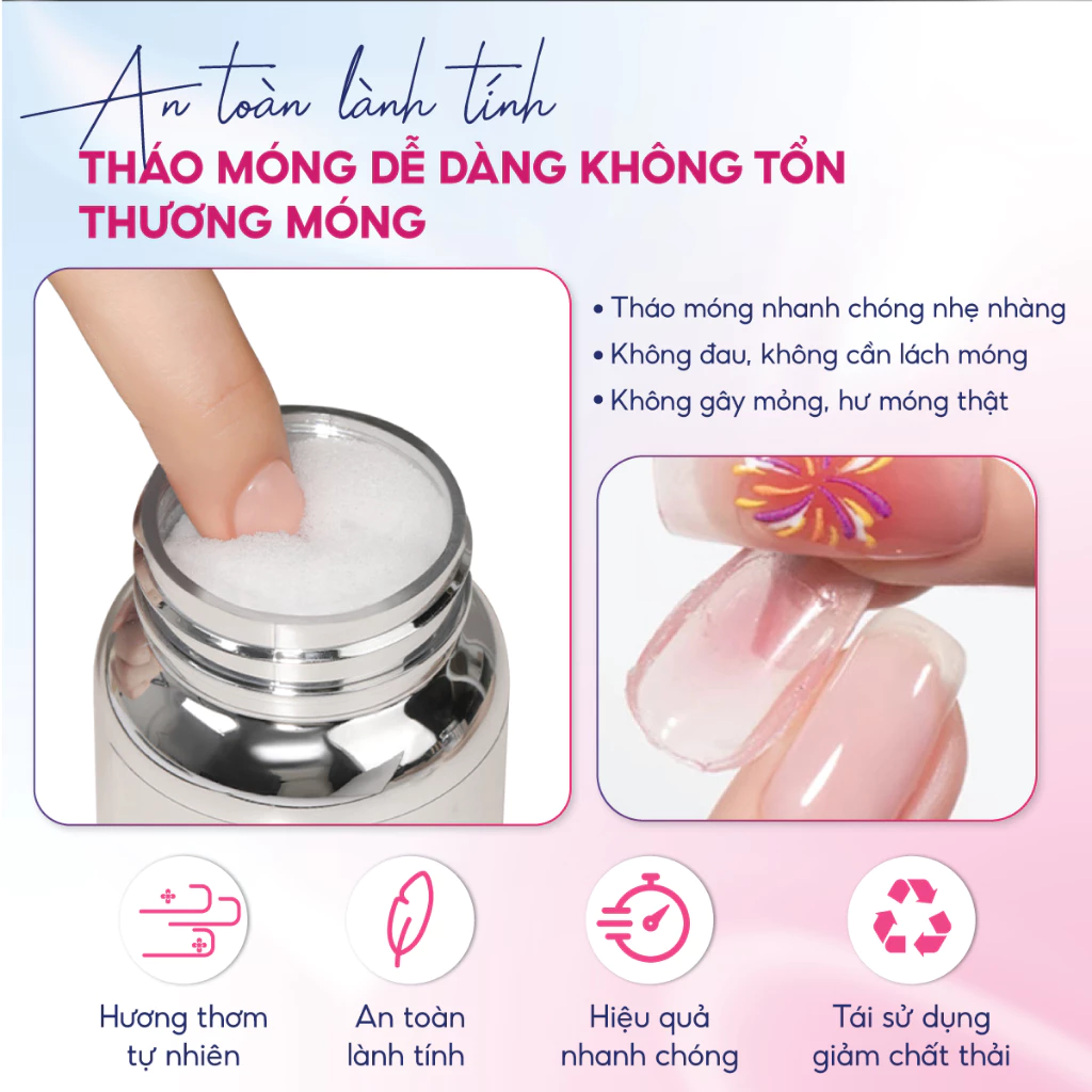 Tháo móng tự nhiên không cần sử dụng lực, không cần lách móng gây đau, mỏng móng