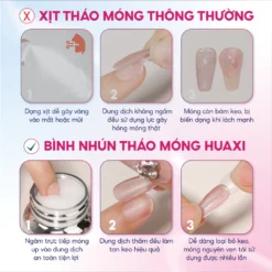 Nước tháo móng Huaxi hoạt động theo nguyên lí làm tan, phân rã lớp keo, gel dán móng một cách tự nhiên, không cần sử dụng lực, không làm ảnh hưởng đến cấu trúc móng up cũng như móng thật.