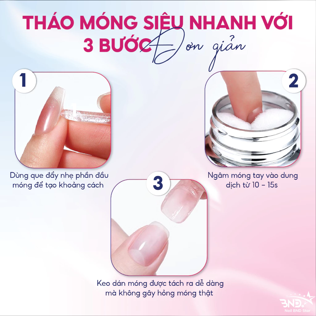 Thao tác đơn giản chỉ cần cho tay vào dung dịch móng giả sẽ tự bong ra, dễ sử dụng tại nhà cho cả người không có kinh nghiệm.