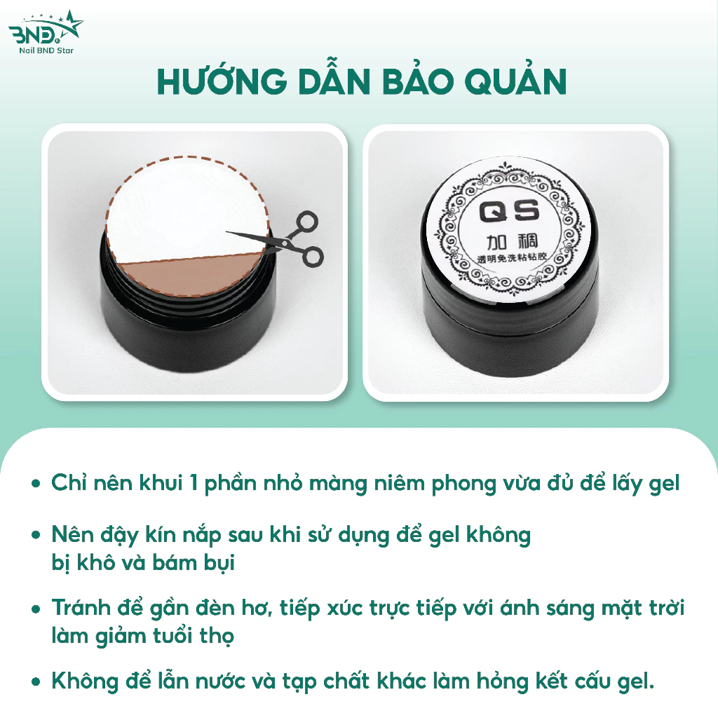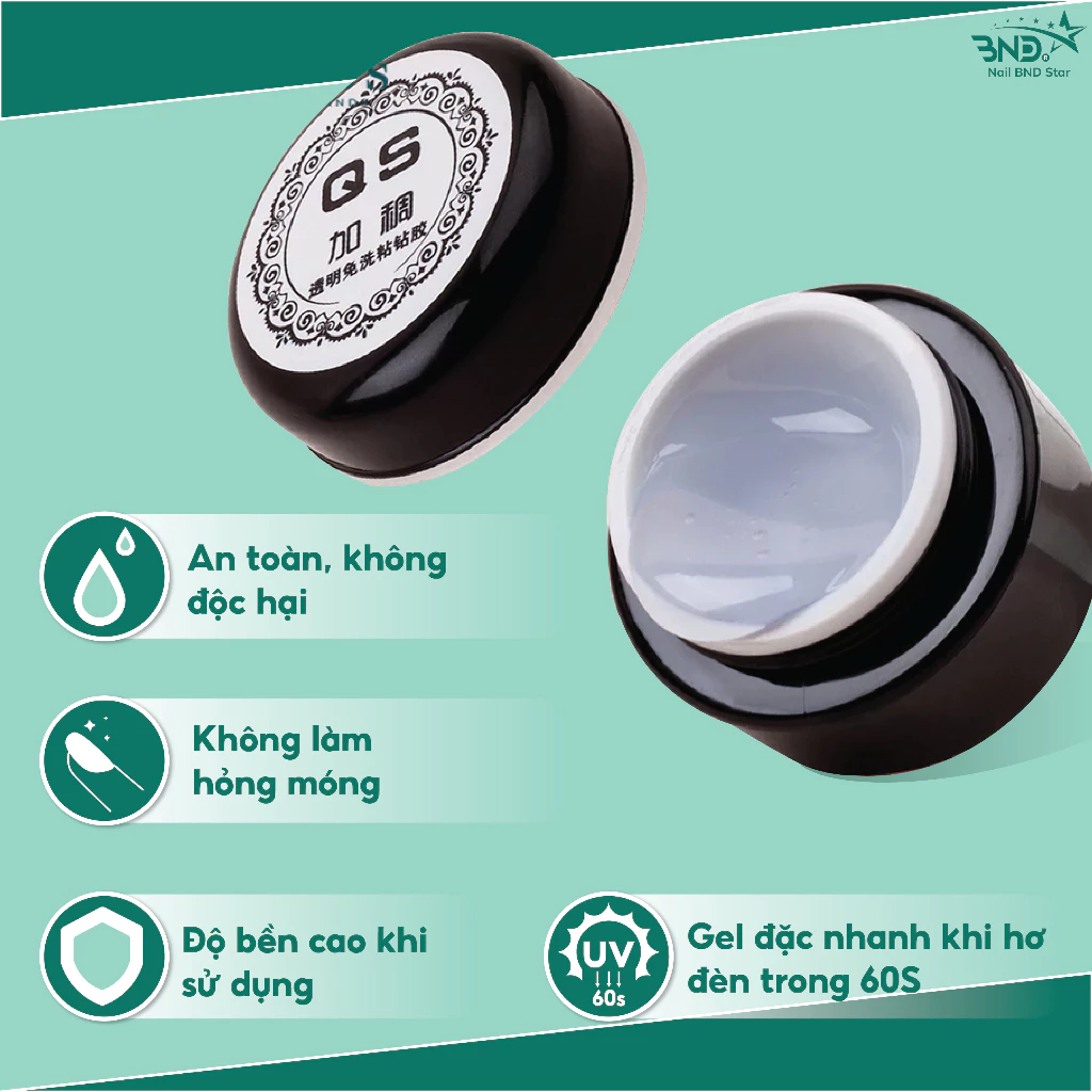 Gel QS là một sản phẩm chất lượng dùng để trang trí móng tay. Sản phẩm có dạng gel đựng trong hũ dung tích 20ml với độ đặc cao, giúp người dùng dễ dàng kiểm soát lượng gel khi vẽ, tạo hình hoặc đính đá trên móng tay một cách chính xác. Đây chính là một loại gel đa năng dễ sử dụng và được nhiều thợ nail ưa chuộng.