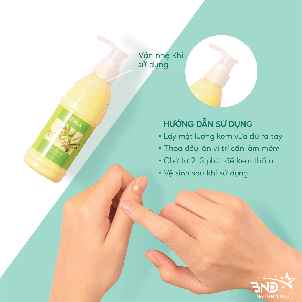 Kem mềm da Xina chứa những dưỡng chất cần thiết nuôi dưỡng và bảo vệ vùng da quanh nail, cùng với đó là thiết kế dạng vòi pump tiện lợi tiết kiệm thời gian trong quá trình chăm sóc móng.