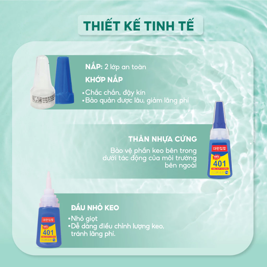 Keo 401 được thiết kế với dáng lọ nhỏ gọn thuận tiện cho quá trình sử dụng, di chuyển và cất giữ.