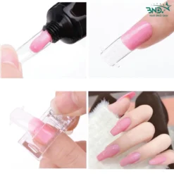– Bước 2: Chải gel liên kết. Đắp móng bột, lụa, gel, giấy (theo yêu cầu của khách). Sau đó dùng kẹp cố định phom móng giữ móng nối vào form chuẩn đẹp