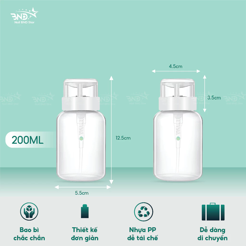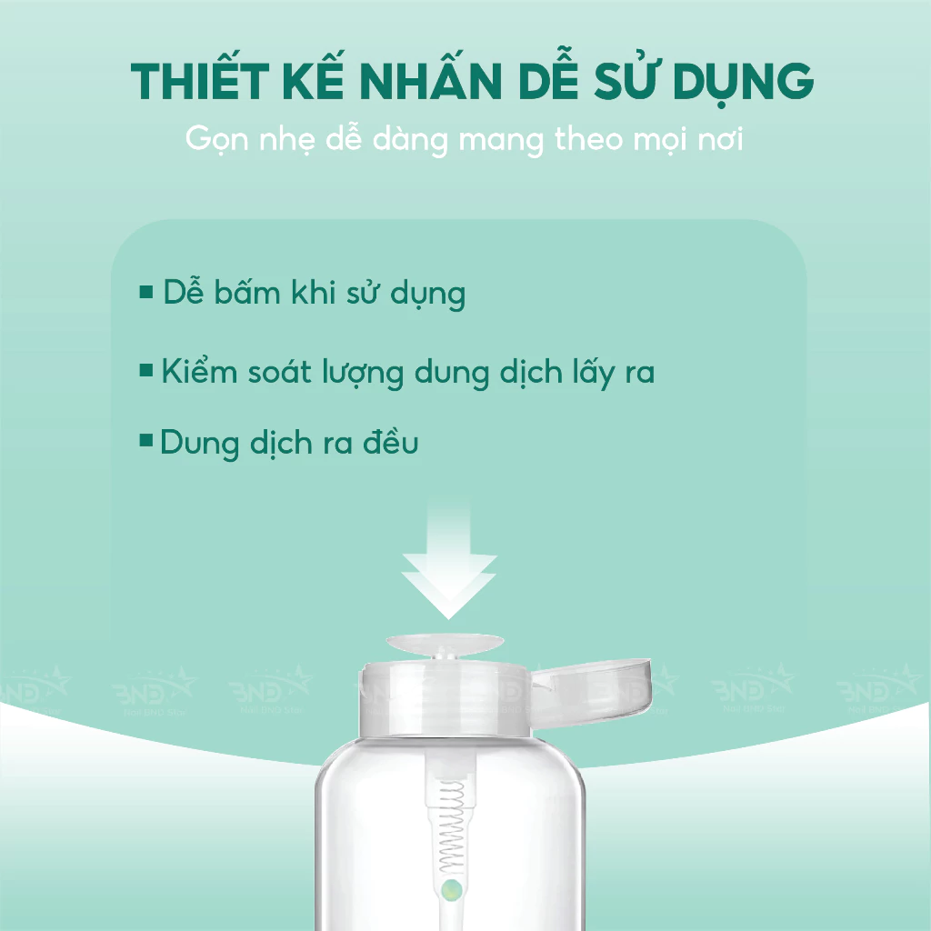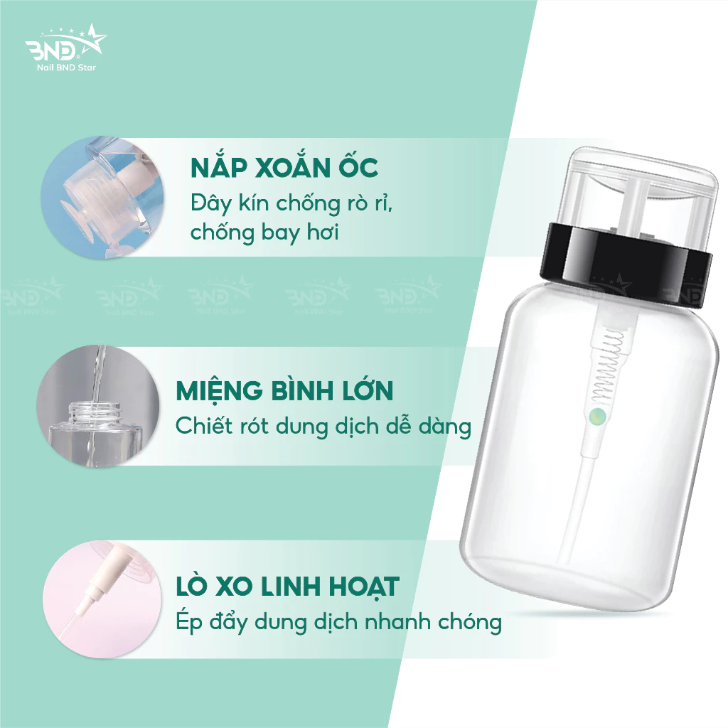 Lọ được làm bằng nhựa plastic siêu bền. Lò so xịn chịu được lực nén tốt nên các chị nhấn lấy cồn và acetone thoải mái không lo bị hỏng vòi hút.