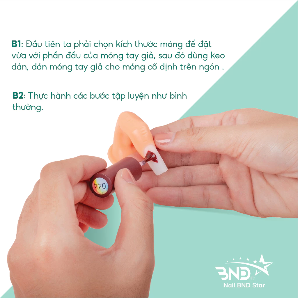 + Bước 1: Đầu tiên ta phải chọn kích thước móng để đặt vừa với phần đầu của móng tay giả, sau đó dùng keo dán chuyên dụng dán móng tay giả sao cho móng được cố định chặt trên ngón .