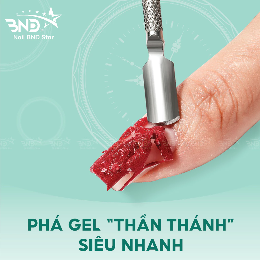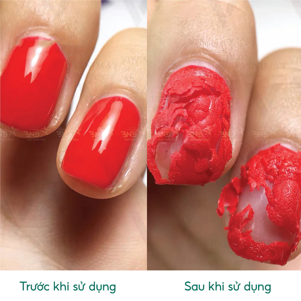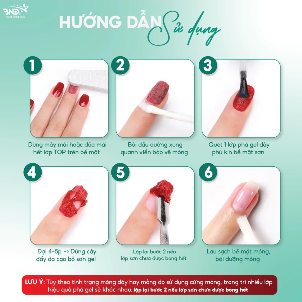 – Tùy theo tình trạng móng dày hay mỏng do sử dụng cứng móng, trang trí nhiều lớp. Hiệu quả phá gel sẽ khác nhau, không liên quan đến chất lượng sản phẩm, lặp lại các bước trên nếu lớp gel chưa được bong tróc hết.