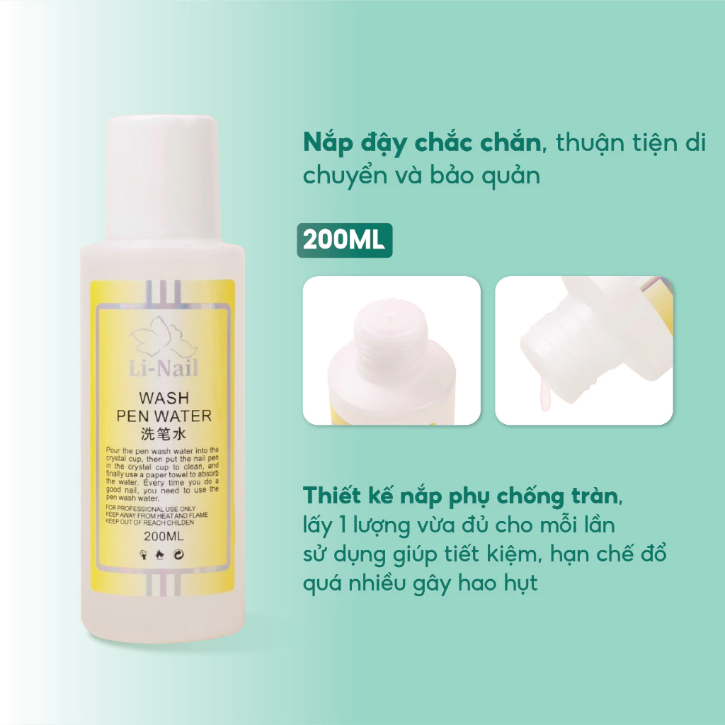 Nước rửa cọ Li_nail được thiết kế nắp đậy chắc chắn, thuận tiện trong việc di chuyển và bảo qaurn, không lo sản phẩm bị đổ hoặc bị bay hơi.