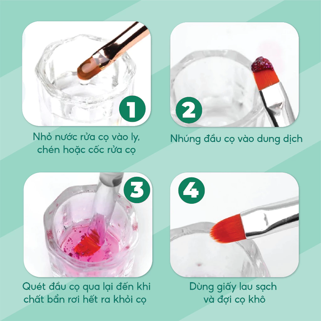 + Đặc điểm: Có thể sử dụng rửa cho tất cả các loại cọ nail: cọ đắp bột, cọ đắp gel, cọ vẽ,…