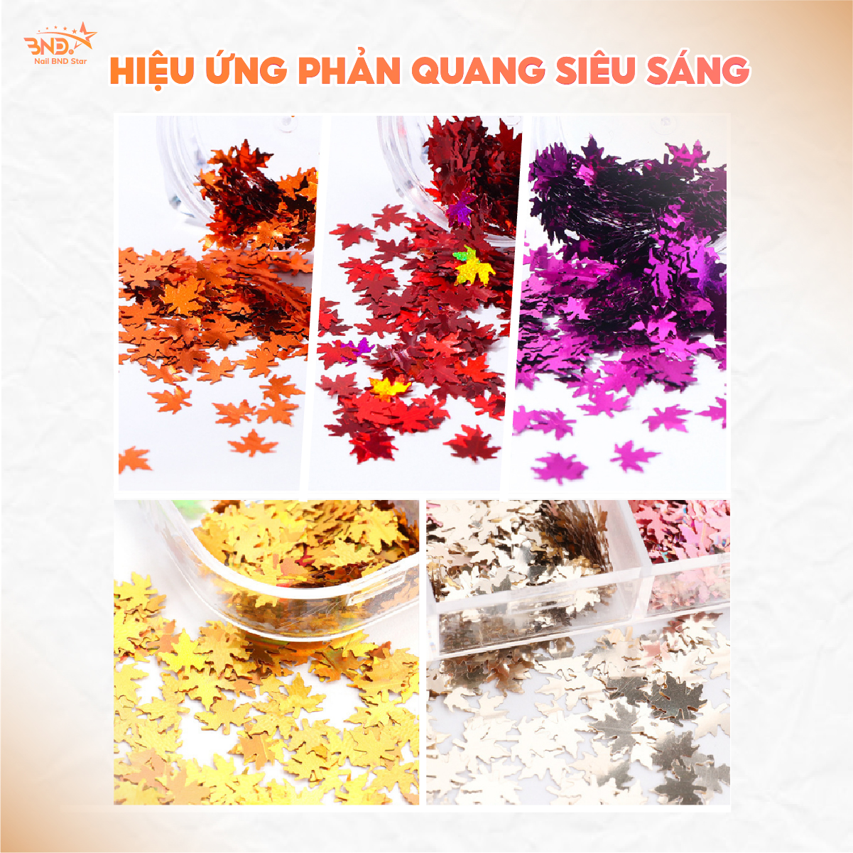 Set lá phong 12 ngăn gồm nhiều chiếc nhũ kim tuyến có hình lá phong nhiều màu sắc dùng để đắp gel, ẩn móng, thợ nail có thể kết hợp trên nhiều màu nền khác nhau. Rất thích hợp để design những mẫu nail theo phong cách Hàn và Nhật.
