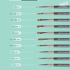 – Set cọ gồm 10 cây :Ba cây cọ râu 3 size; Cọ tròn nhỏ; Cọ tô; Hai cây cọ bản số 2 và số 3; Cọ bản xéo; Cọ chải gel; Cọ đắp hoa bột.