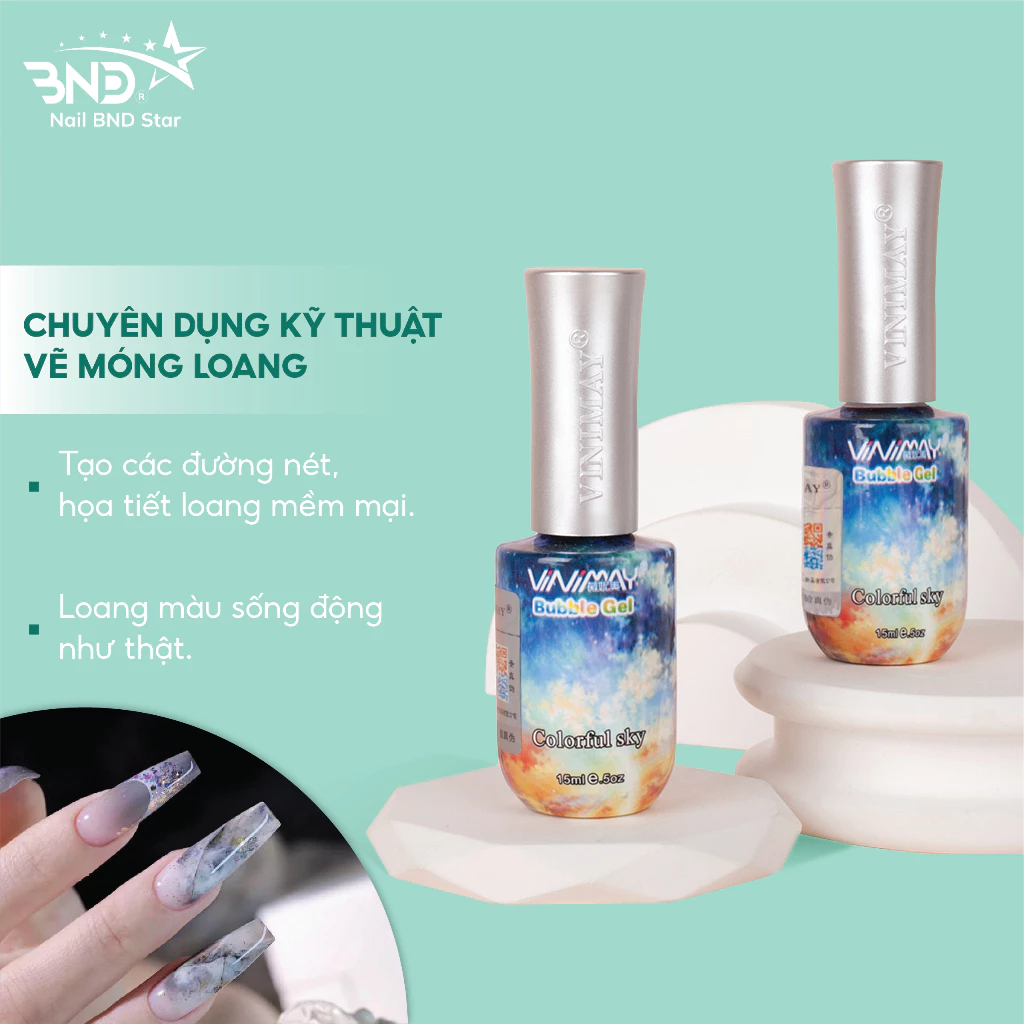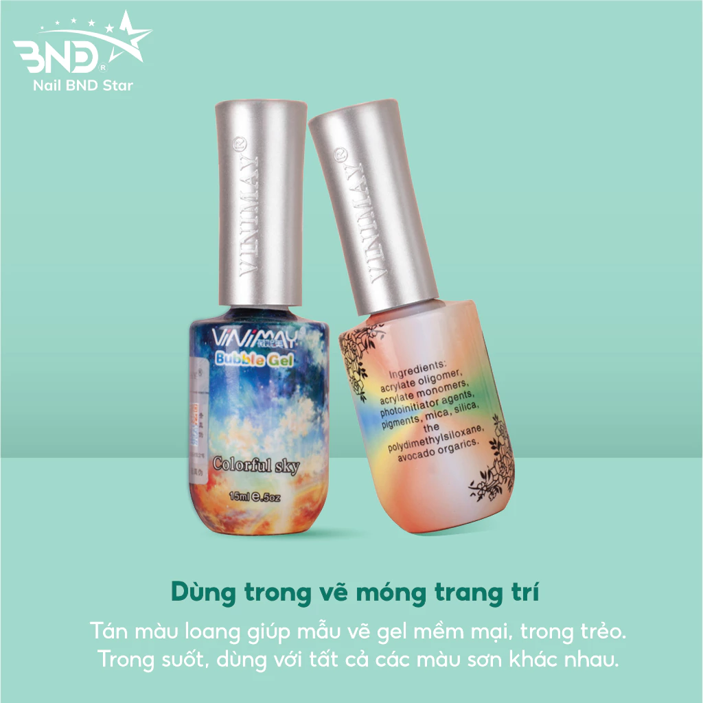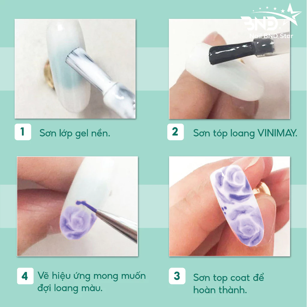 Top loang Vinimay dùng trong vẽ móng trang trí. Việc tán màu loang sẽ giúp cho những mẫu vẽ gel trông mềm mại hơn, trong trẻo, sống động như thật.