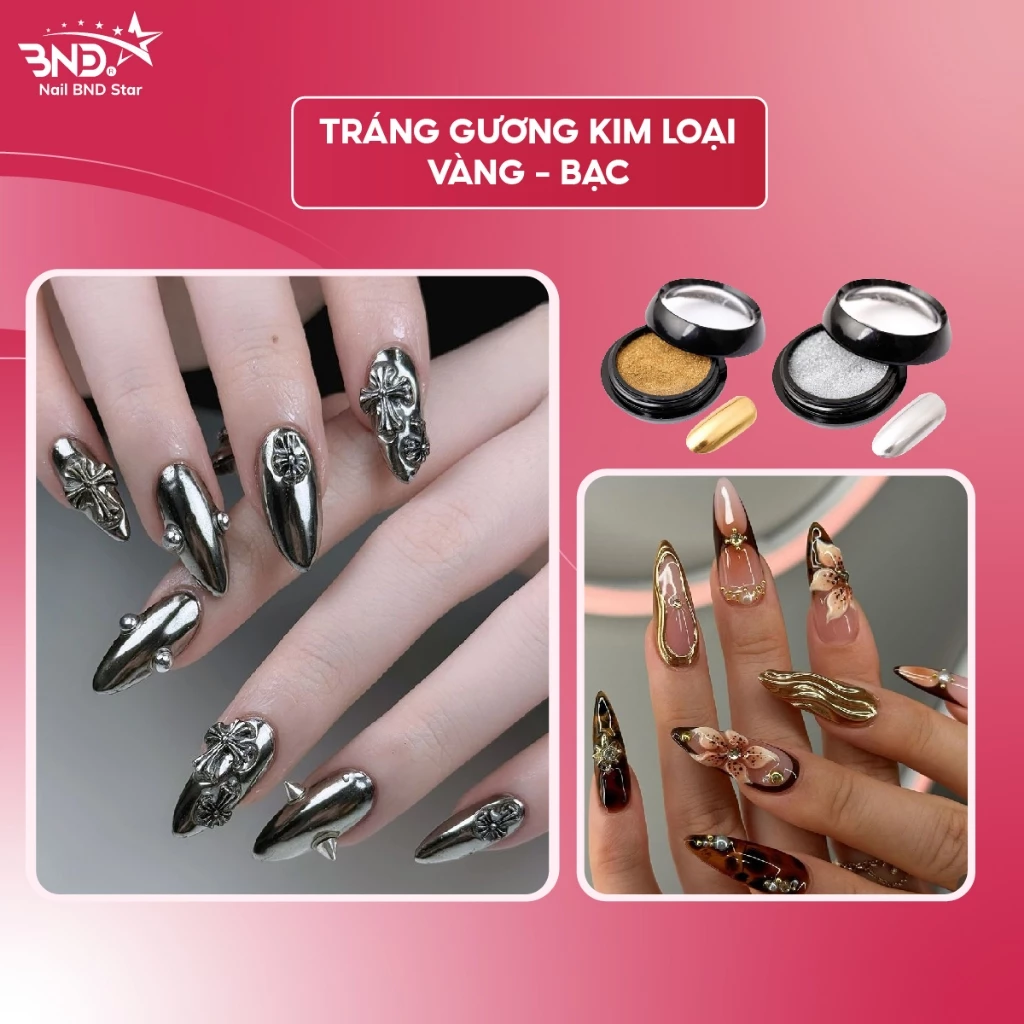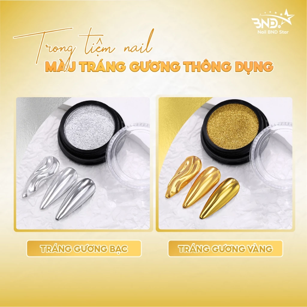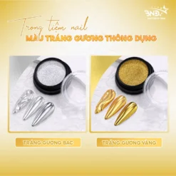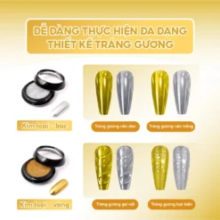 Tráng gương kim loại với hai màu Vàng và Bạc là hai loại tráng gương phổ biến nhất trong mỗi tiệm nail, được ứng dụng trên nhiều kiểu design, tráng gương full móng, tráng gương vẽ nổi,..