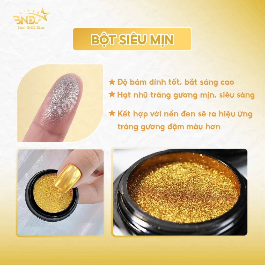 Bột tráng gương kim loại có chất bột siêu mịn, khi thao tác chà lên móng tùy theo màu nền khác nhau sẽ thể hiện được những ánh tráng gương khác nhau. Nhờ đó mang đến 1 lớp phủ sáng bóng như lớp gương trên bề mặt móng, bột tráng gương có thể kết hợp trên nhiều thiết kế nail khác nhau, dễ dàng sử dụng cho cả người mới học nail.