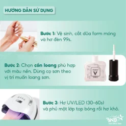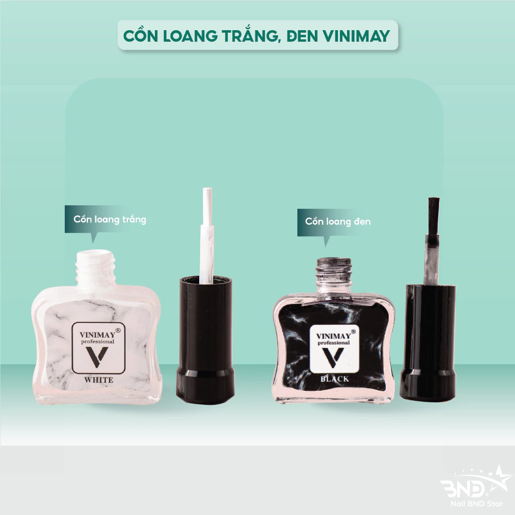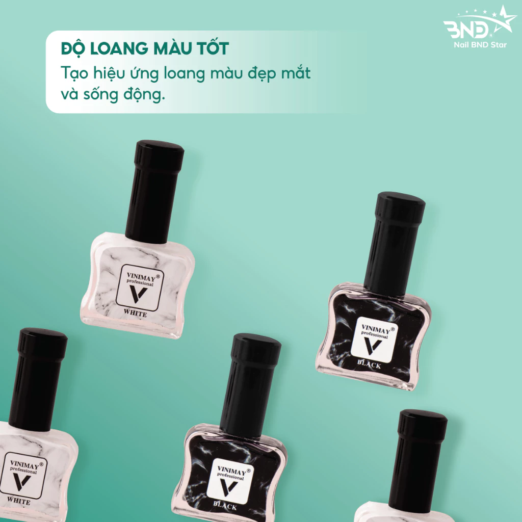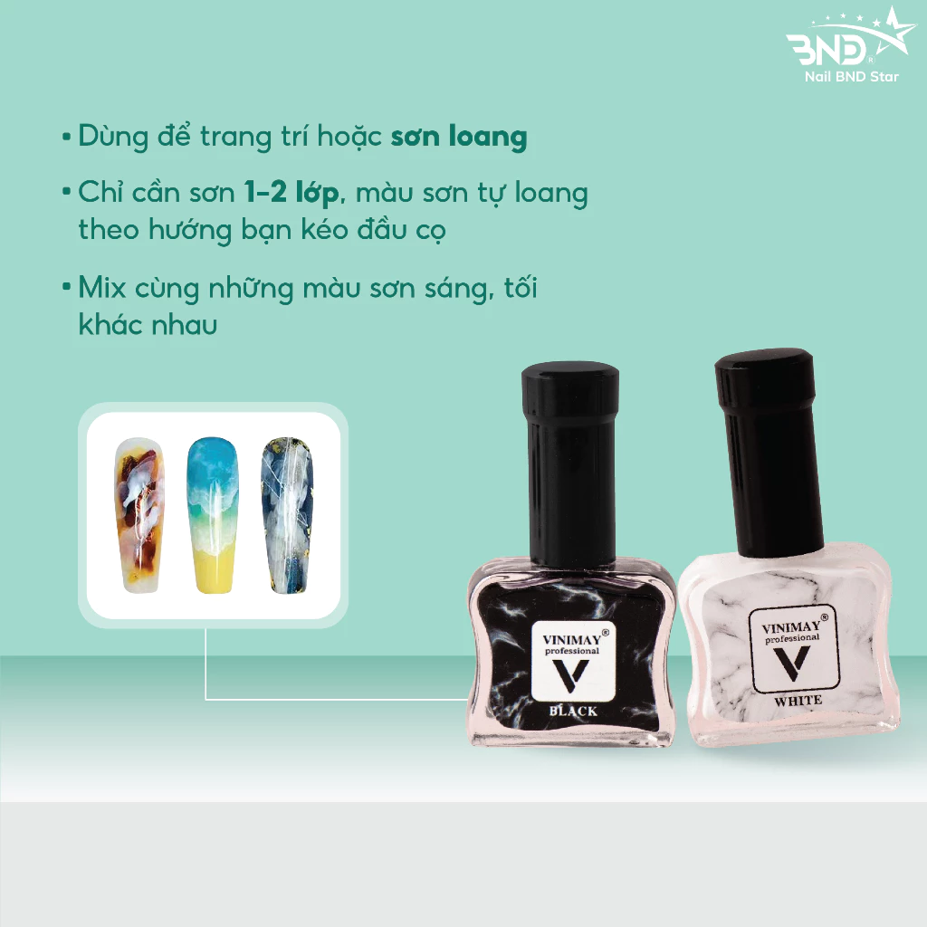 Cồn loang Vinimay trắng, đen nhanh khô, phù hợp để thợ nails mix cùng những màu sơn sáng, tối khác nhau. Với cồn loang Vinimay trắng, đen, bạn chỉ cần sơn 1_2 lớp, màu sơn tự loang theo hướng bạn kéo đầu cọ, giúp thợ nails tiết kiệm chi phí mua phụ kiện sơn loang mà vẫn có bộ nail tuyệt đẹp, trông tự nhiên.