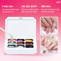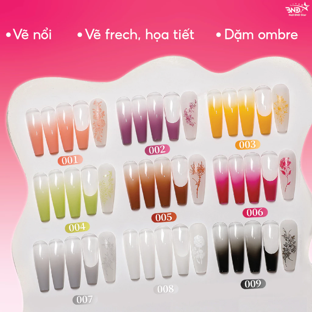 Set 9 màu gel vẽ, dặm ombre chất mịn mướt, dễ tán, không vón cục là giải pháp thay thế hoàn hảo cho loại bột pha ombre truyền thống. Không cần mix bột, không cần dùng máy phun giúp việc design móng trở nên nhanh chóng, thuận tiện hơn.