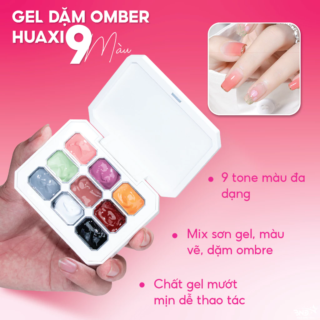 Gel dặm ombre Huaxi 9 màu chính hãng, đa dạng tone màu từ gam trầm đến gam sáng, giúp thợ nail có nhiều sự lựa chọn, sáng tạo.