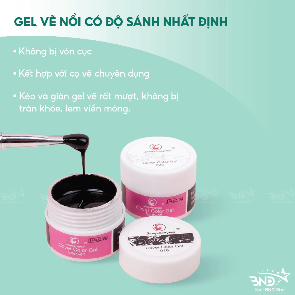 Gel vẽ nổi có độ sánh nhất định, không bị vón cục, kết hợp với cọ vẽ chuyên dụng, giúp thợ nails kéo và giàn gel vẽ rất mượt, không bị tràn khóe, lem viền móng. Ngoài ra, gel vẽ móng vẽ còn giúp thợ nails sáng tạo ra những mẫu móng họa tiết nổi cực đẹp và lạ mắt.