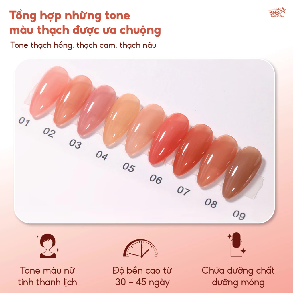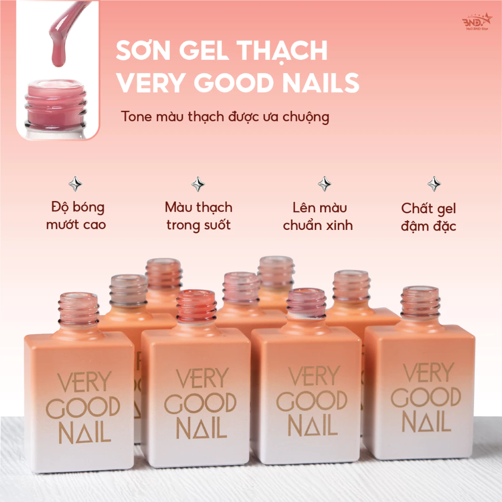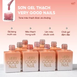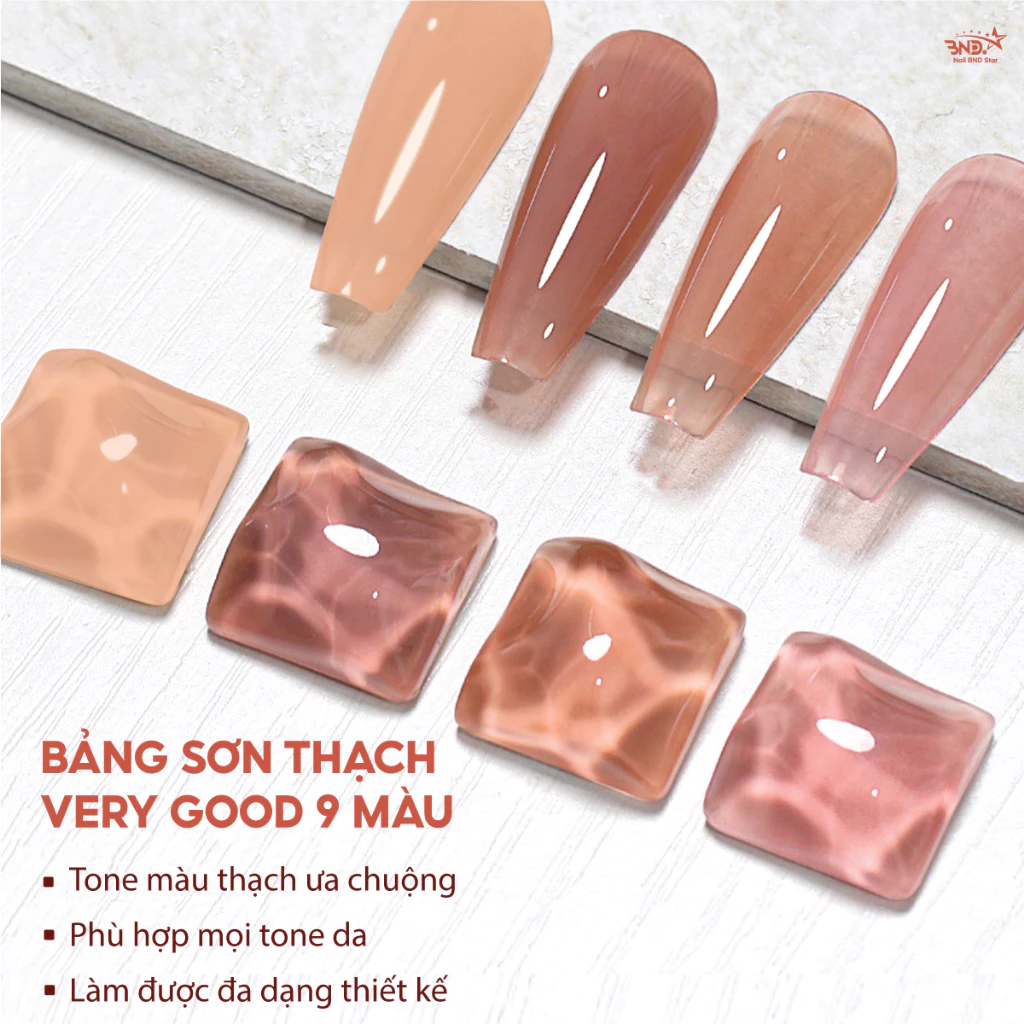 Sơn móng tay gel thạch Very Good 9 màu sở hữu chất thạch trong suốt, bóng mướt, tạo lớp màu mỏng nhẹ tự nhiên cho những khách hàng theo phong cách thanh lịch nhẹ nhàng. Set sơn này rất được ưa chuộng tại các tiệm nails theo phong cách Hàn Quốc, Nhật Bản.
