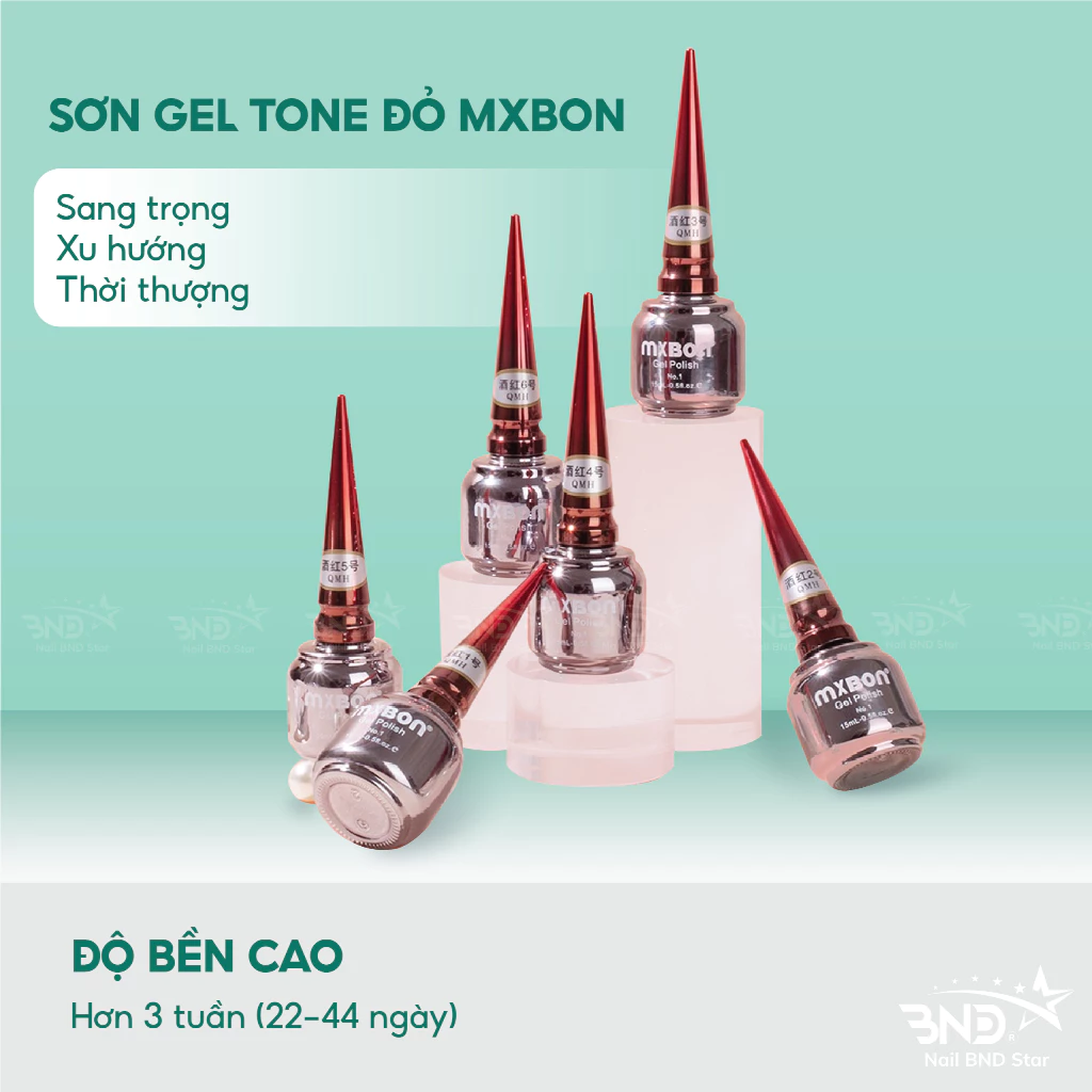Sơn gel Mxbon tone đỏ được sử dụng rộng rãi và phổ biến trong ngành nails. Thiết kế hình dáng lọ sơn cực kì sang cảnh, hợp xu hướng gần đây, màu sắc thời trang thích hợp để bày trưng decor kệ ở các tiệm nails.